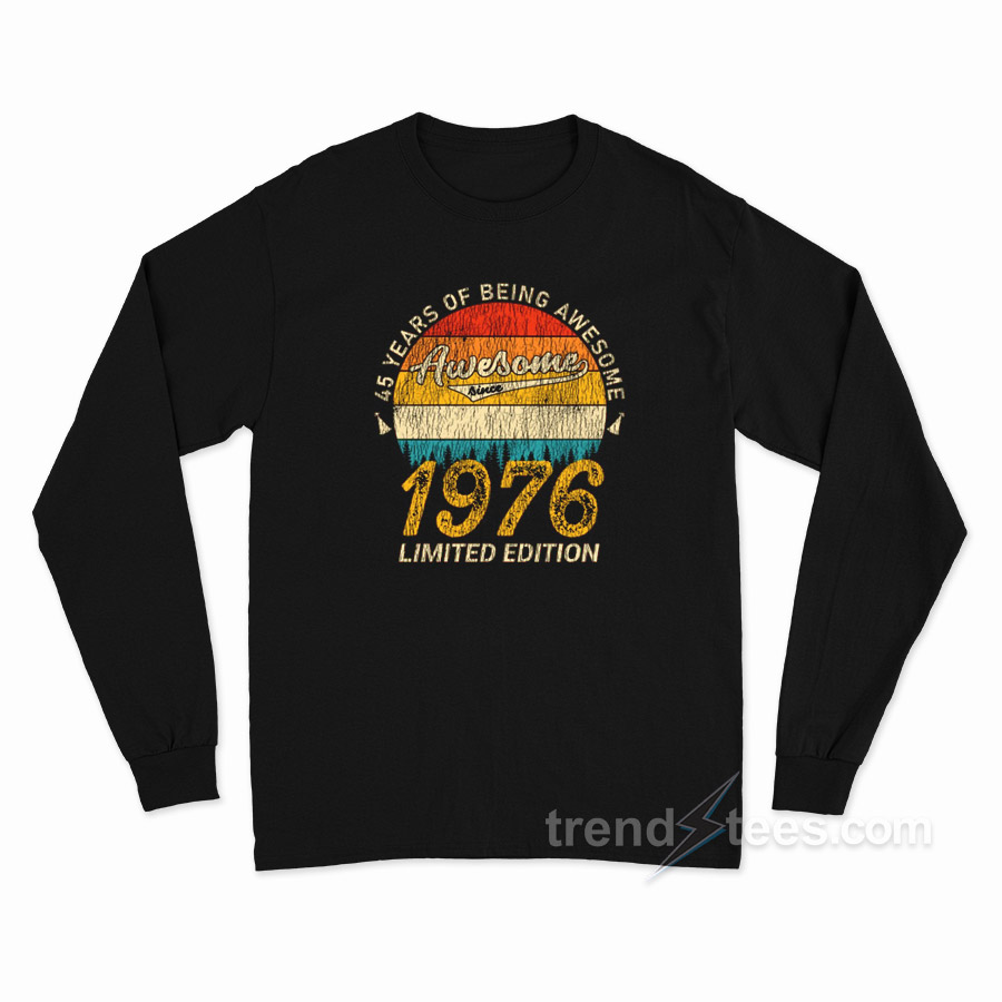 Product Trendstees Everything is hand printing by our team at our warehouse using Eco-friendly inks and suppliers. All designs 45 Years of Being Awesome 1976 Limited Edition Long Sleeve Shirt The ink is pressed into the fabric permanently and healed at high temperatures. It makes the image will not fade, crack, or wipe. This long sleeve t-shirt can be the best gift for your loved one.