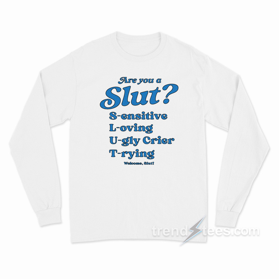 Product Trendstees Everything is hand printing by our team at our warehouse using Eco-friendly inks and suppliers. All designs Are You A Slut Long Sleeve Shirt The ink is pressed into the fabric permanently and healed at high temperatures. It makes the image will not fade, crack, or wipe. This long sleeve t-shirt can be the best gift for your loved one.