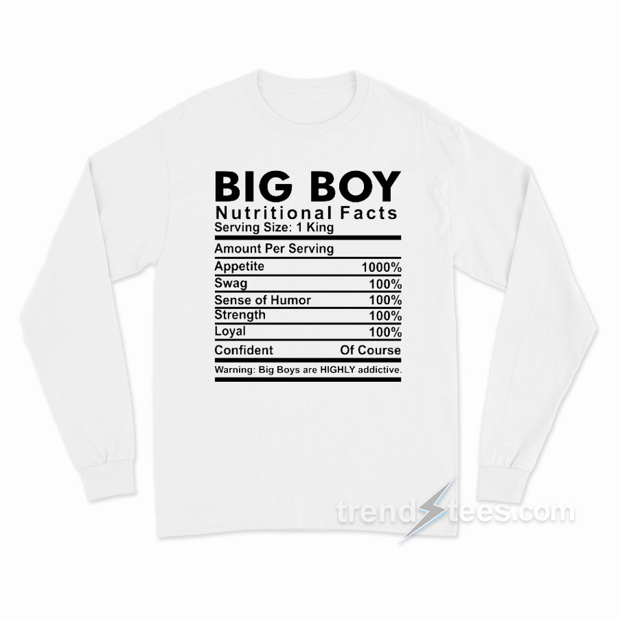Product Trendstees Everything is hand printing by our team at our warehouse using Eco-friendly inks and suppliers. All designs Big Boy Nutritional Facts Long Sleeve Shirt The ink is pressed into the fabric permanently and healed at high temperatures. It makes the image will not fade, crack, or wipe. This long sleeve t-shirt can be the best gift for your loved one.