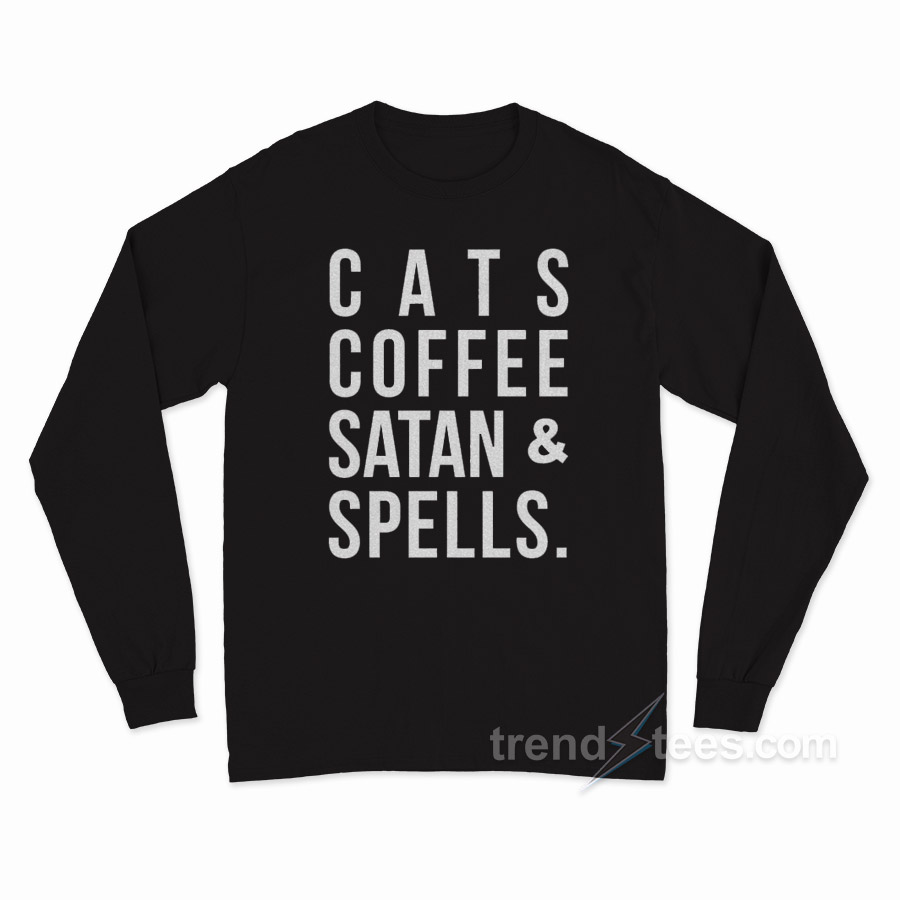 Product Trendstees Everything is hand printing by our team at our warehouse using Eco-friendly inks and suppliers. All designs Cats Coffee Satan And Spells Long Sleeve Shirt The ink is pressed into the fabric permanently and healed at high temperatures. It makes the image will not fade, crack, or wipe. This long sleeve t-shirt can be the best gift for your loved one.