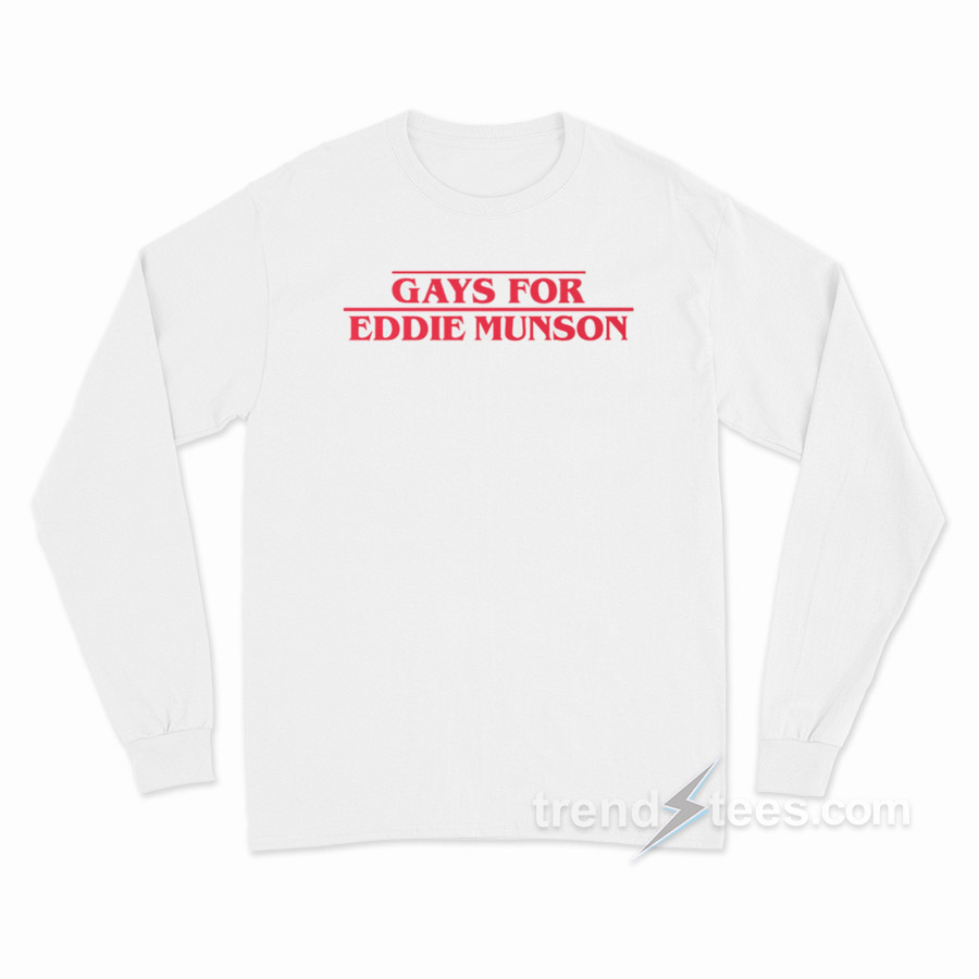 Product Trendstees Everything is hand printing by our team at our warehouse using Eco-friendly inks and suppliers. All designs Gays for Eddie Munson Long Sleeve Shirt The ink is pressed into the fabric permanently and healed at high temperatures. It makes the image will not fade, crack, or wipe. This long sleeve t-shirt can be the best gift for your loved one.