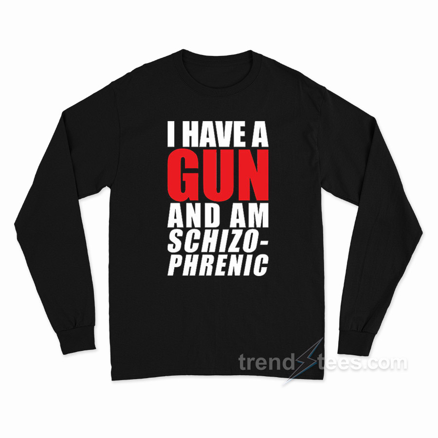 Product Trendstees Everything is hand printing by our team at our warehouse using Eco-friendly inks and suppliers. All designs I Have A Gun And Am Schizophrenic Long Sleeve Shirt The ink is pressed into the fabric permanently and healed at high temperatures. It makes the image will not fade, crack, or wipe. This long sleeve t-shirt can be the best gift for your loved one.