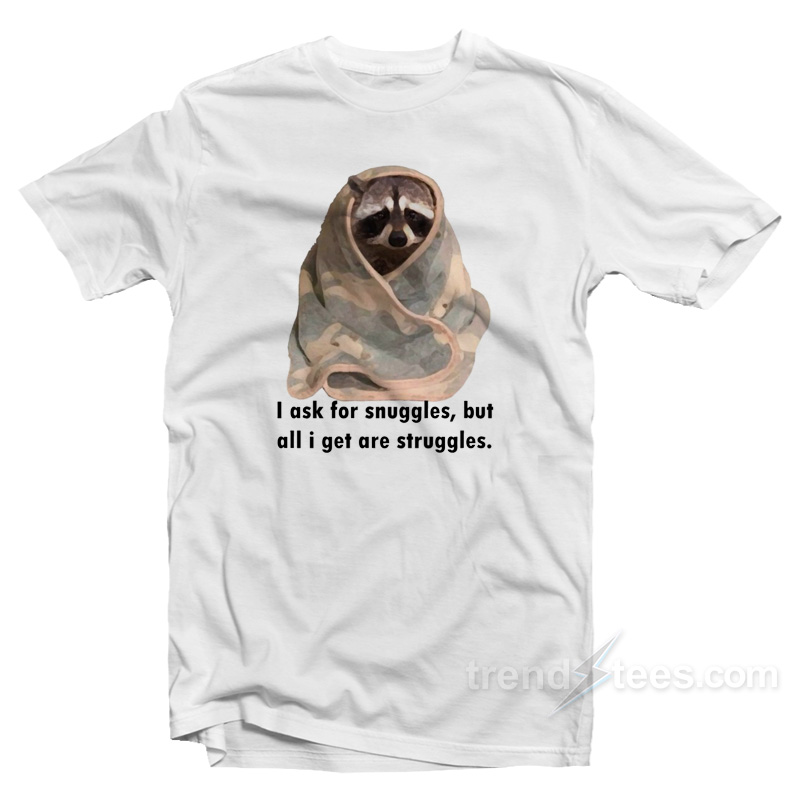 Racoon What I Ask For Snuggles What I Get Struggles T-Shirt For Sale Size S, M, L, XL, 2XL, 3XL